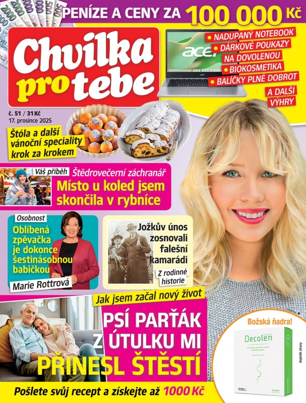 Pokud jde o předplatné časopisu Chvilka pro tebe, magazín potěší jistě každého, kdo se chce pobavit, dozvědět něco praktického a zajímavého pro život. Časopis je plný pohody a stane se inspirací pro celou rodinu.